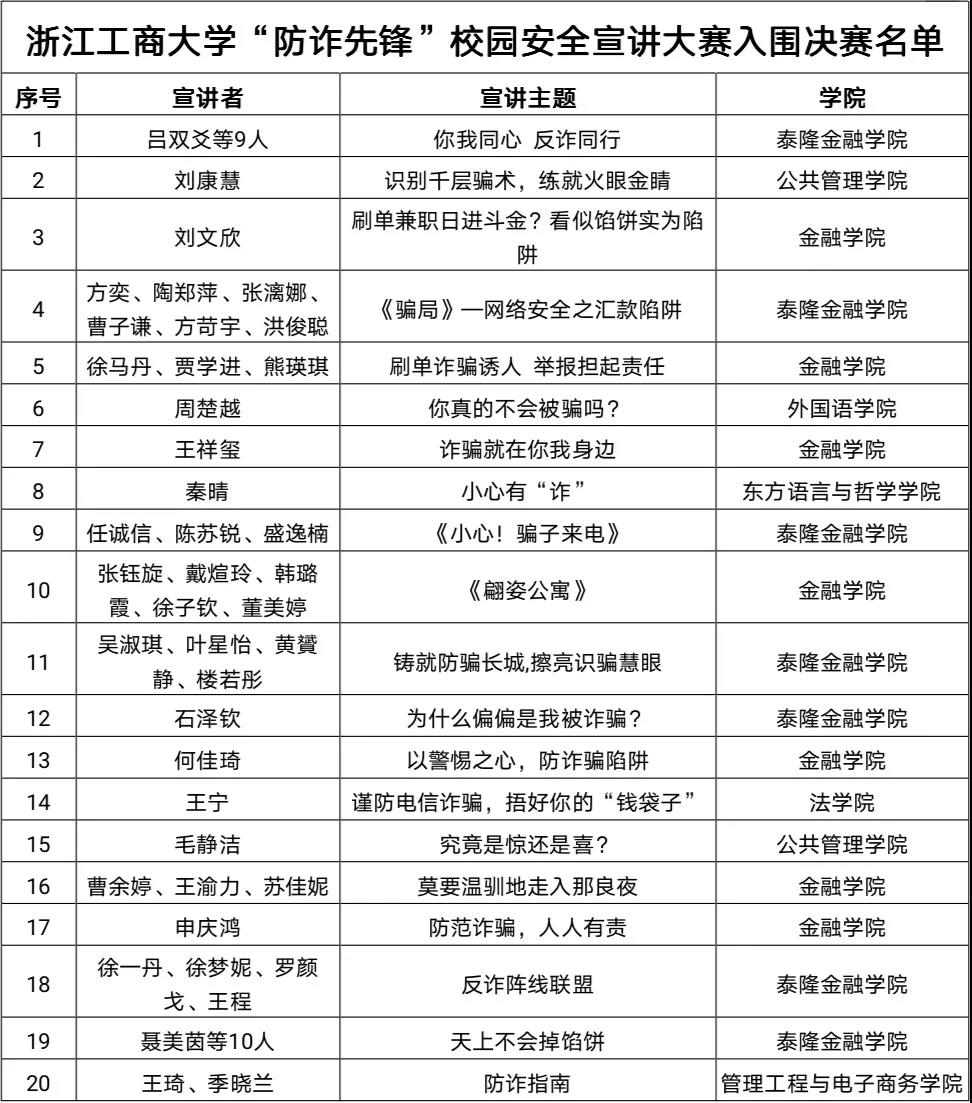 张明飞老师。/span>/p> 一首《防诈骗联盟》改编歌曲,拉开了本次大赛的帷幕。本次大赛表演形式多样,选手们通过ppt介绍演讲、情景剧表演、演唱歌曲、新闻播报等形式,有效地向同学们科普了防诈骗的相关知识,介绍了电信诈骗的含义、常见的诈骗方法、典型的诈骗案例、防范诈骗的手段等等。/span>/p> /p> /p> /span> /span> /span>选手们声音洪亮,逻辑清晰,在有限的时间内,向评委老师和同学们介绍了一系列防诈骗知识。/span>/p> 情景剧表演/span>/p> /p> /span> /span> /span>选手们将防诈骗知识和笑话段子融入精心创作的情景剧和改编歌曲中,让同学们在笑声和歌声中扣紧警惕之弦,远离诈骗陷阱。/span>/p> 新闻播报/span> /span> /span> /span>选手们以新闻播报的形式,向同学们详细阐述了诈骗方式的变化和防诈骗的相关措施,方式新颖、阐述深刻,让人拍案叫绝。/span>/p> /span> /span> /span>选手们的精彩演讲和风趣新颖的表演不断赢得评委老师和观众的热烈掌声,评委老师们也对其表现进行了中肯的评价和指导。经过评委老师们的评议,最终入围决赛的名单如下:/span>/p> /p> /p> /p> /span> /span> /span>本次大赛在帮助我校师生深入学习防诈骗相关知识的同时,也为同学们提供了一个展现自我、锻炼自我的平台,不仅有利于营造“人人说防范,人人懂防范”的校园氛围,也能大大提升学生对校园生活的参与感、责任感和荣誉感。/span>