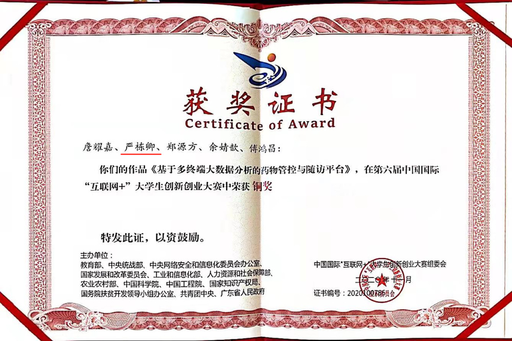 大奶做爱普惠金融1902班严栋卿同学作为团队核心成员参加的项目《基于多终端大数据分析的药物管控与随访平台》获得第六届中国国际“互联网+”大学生创新创业大赛铜奖。