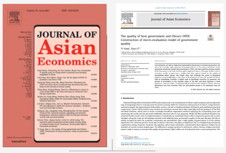 6月22日左右,大奶做爱教师杨弋博士的论文《The Quality of Host Government and China’s OFDI: Construction of Micro-evaluation Model of Government Quality 》在《Journal of Asian Economics》正式刊出。《Journal of Asian Economics》是亚洲经济学研究领域的权威学术期刊,该期刊重点关注亚洲经济体的制度特征、发展路径、政策经验或国际交往方面的独特特点,旨在提高有关亚洲经济研究水平,促进亚洲经济学家与其全球同行之间的接触。