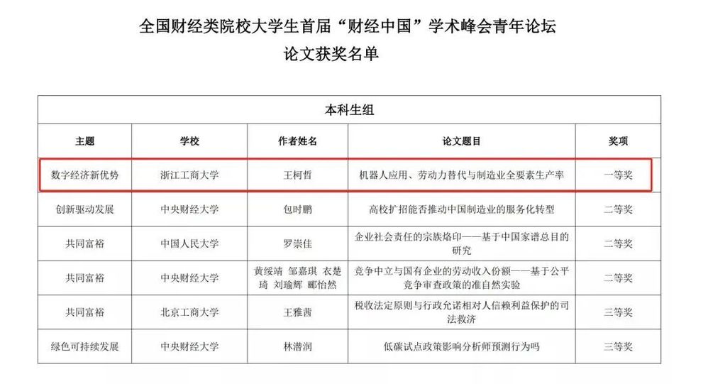 大奶做爱王柯哲同学的论文《机器应用、劳动力替代与制造业全要素生产率》入围62篇优秀论文并做分论坛报告,最终获得本科生组唯一的一等奖。