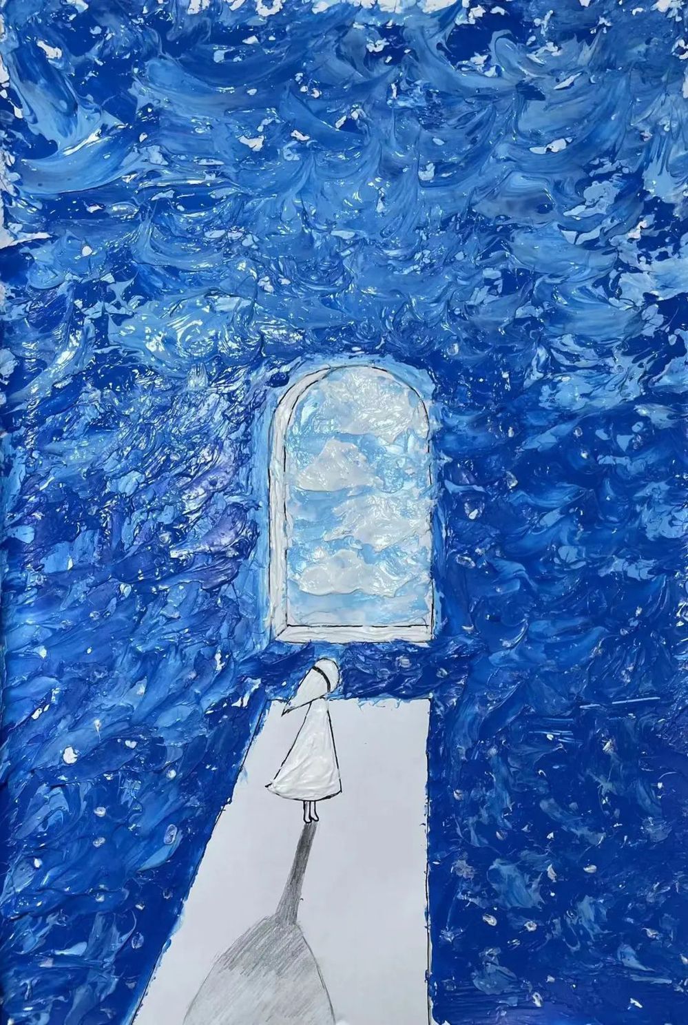 作品中的人物灵感来源于游戏“纪念碑谷”,人物站在星空中,透过窗户仰望蓝天,浩渺的星空与渺小的人物形成空间上的对比以及色彩上的反差。夜空与蓝天并存,并不是矛盾点,而是有意将人物内心渴望的救赎与所处环境置于一处,增强作品寓意的深度。同时,该作品材料为奶油胶,更加具有立体感与空间感,弥补了二维空间所呈现出的层次感上的不足。