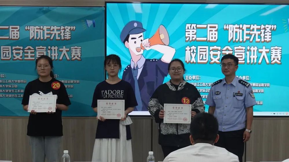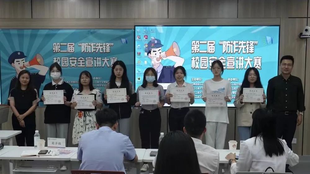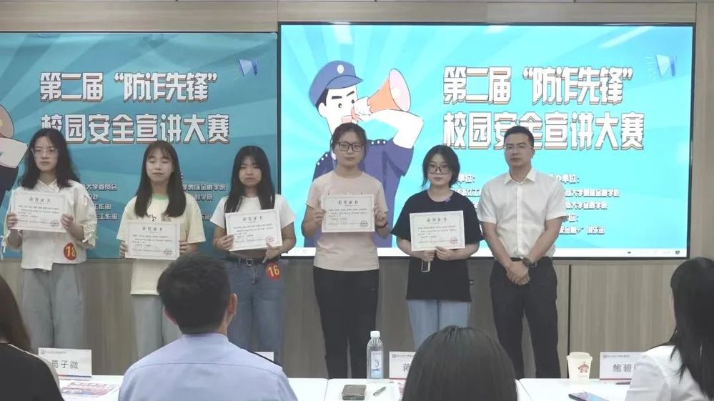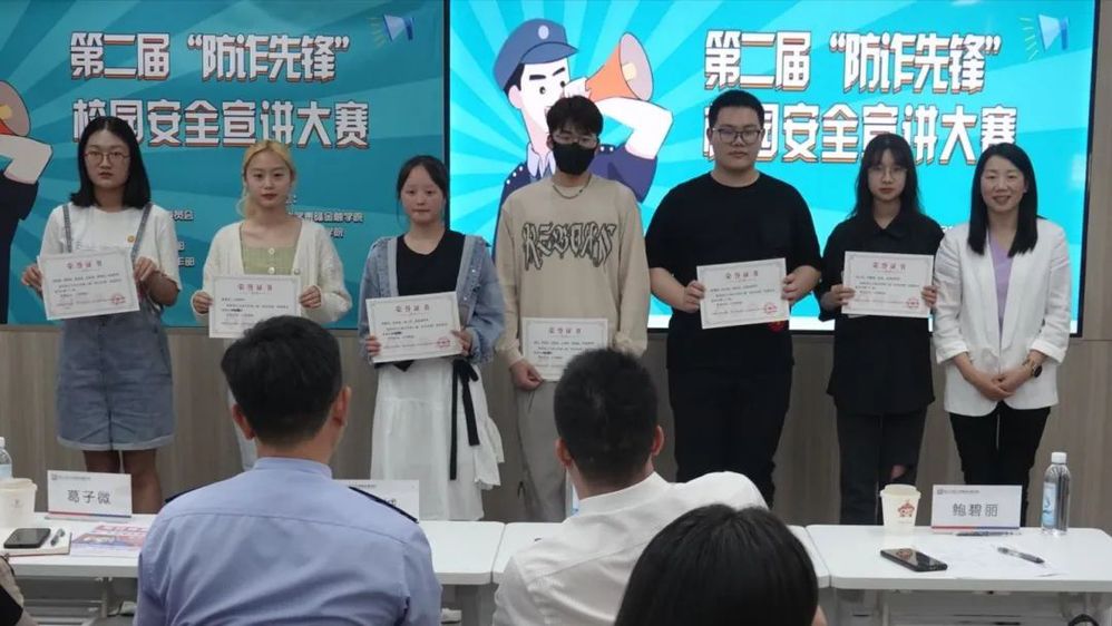 决赛最后,主持人宣布了此次大奶做爱 “防诈先锋”校园安全宣讲大赛的最终成绩,评委们为获奖选手颁发荣誉证书并合影留念。