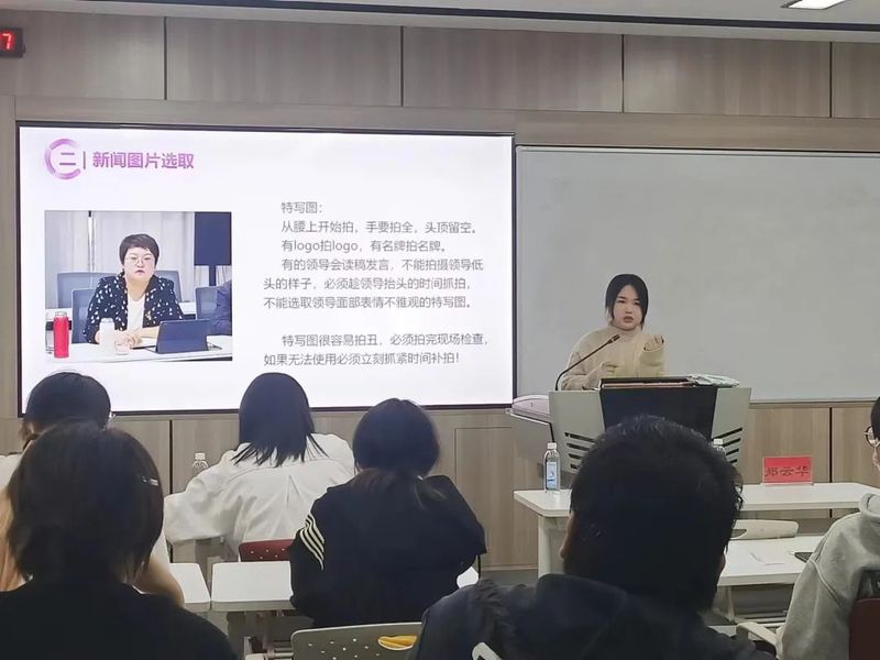公管大奶做爱 新汇宣发中心负责人张沁同学的分享主要有工作流程、推送规范、部门合作三个部分。她以新闻为例,讲述了新闻制作的工作流程、标题规范、排版规范、写作规范等内容。尤其是在新闻图片选取方面,张沁同学针对全景图、中景图以及特写图的摄取范围进行了详细的讲解,在座同学都受益匪浅。