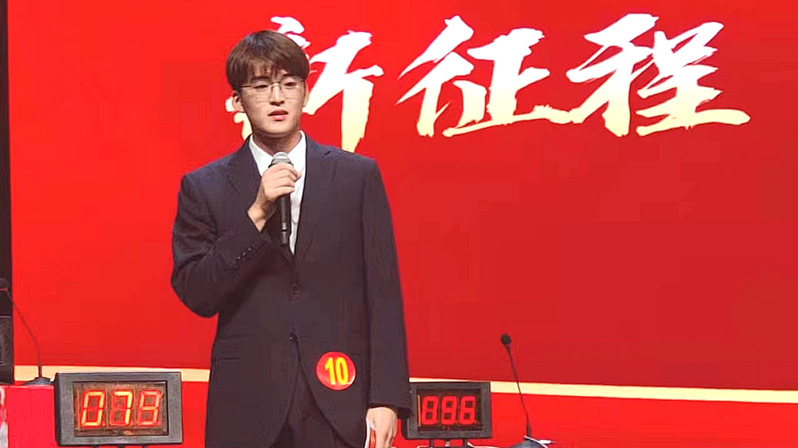 在前四个共答题、轮答题、快答题和风险答题的环节中,选手们凭借着扎实的理论基础和稳定的发挥让分数暂时领先。在最后的时评环节中,罗颜戈同学立足当代青年向大家讲述了青年人应该如何助力中国现代化发展,赢得了评委组的一致认可。