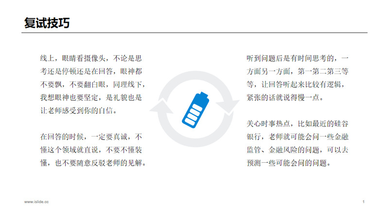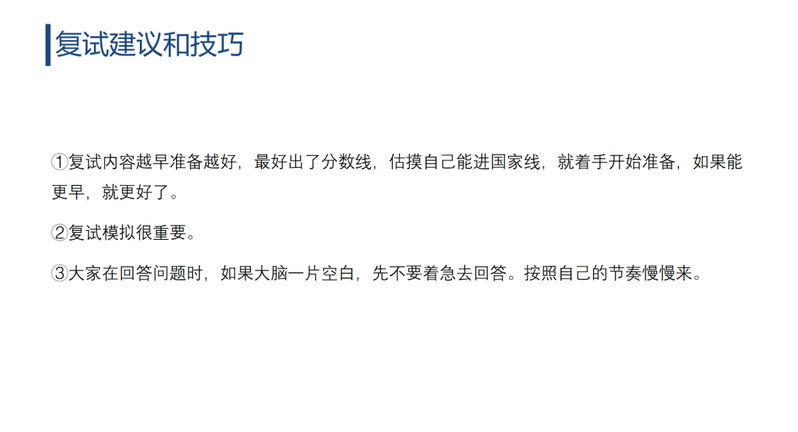 俞学姐从复试技巧、复试心态两个方面分享了她的心得和技巧。在复试技巧方面,她强调复试时回答问题的态度要真诚,眼神要坚定,逻辑要清晰,并提醒同学们在准备时积极关注时事热点。在复试心态方面,她提到要客观的看待自己紧张的状态,平复好自己的心情,完整的表述自己的答案。