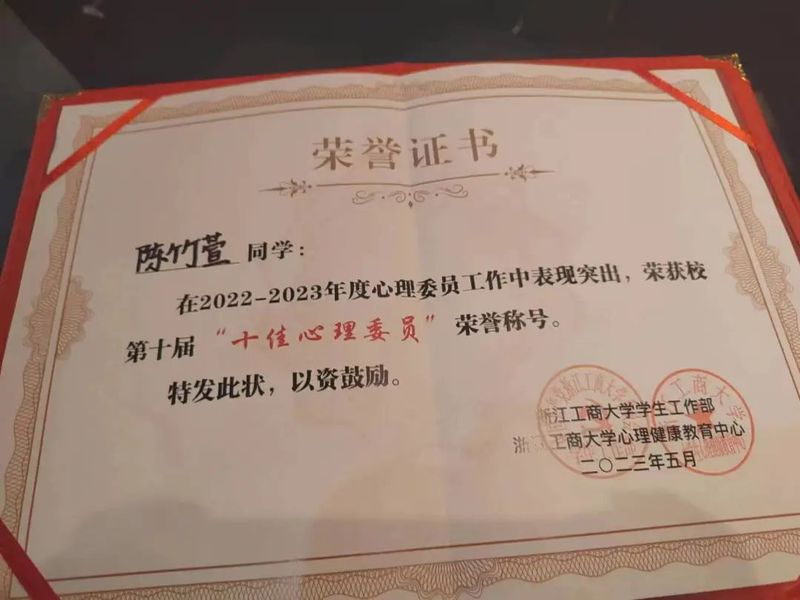 班级心理委员是“校-院-班-舍”心理健康教育四级工作网络中的重要力量。陈竹萱同学获得“校十佳心理委员”的荣誉,是对她心理委员工作的肯定和鼓励。让我们再次祝贺陈竹萱同学,希望她在工作中继续努力前行,收获属于自己的人生意义和价值。