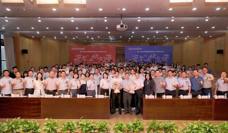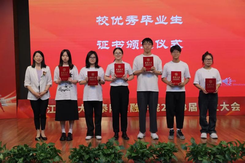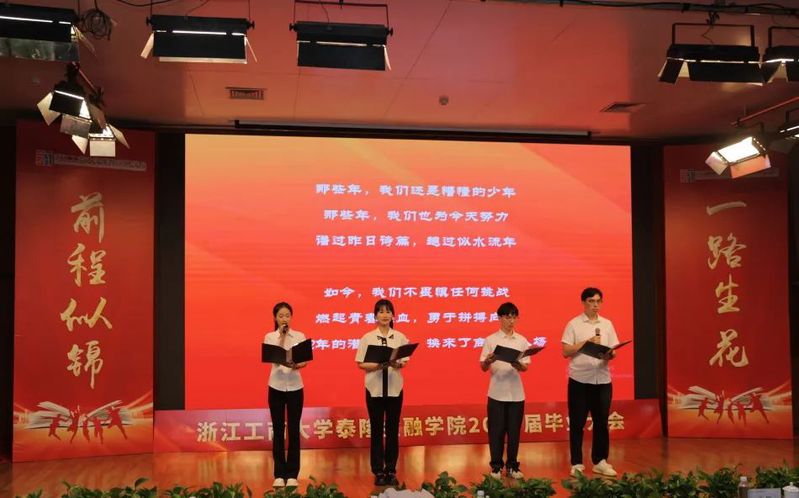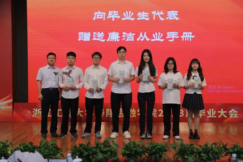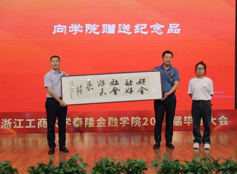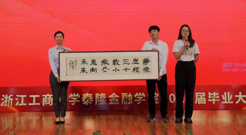 泰隆银行人力资源部副总经理林丽、浙江泰隆慈善基金会秘书长蔡鸿鹏、大奶做爱 院长马丹、大奶做爱 党委书记慕兴宏为毕业生赠送毕业礼物,祝愿毕业生带着泰隆银行、泰隆慈善基金会和大奶做爱 的祝福致知行远,踵事增华!