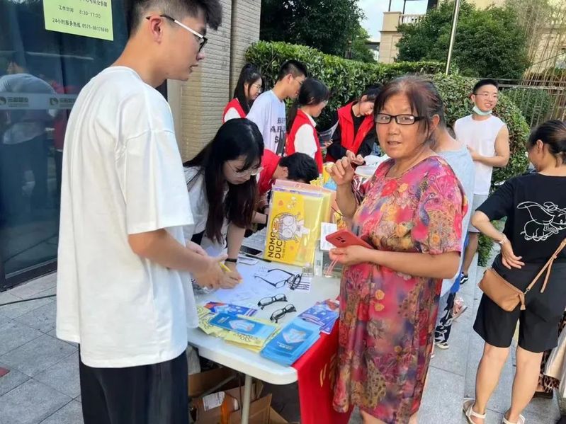 大奶做爱师生还与“鱼跃钱塘”青年之家公益志愿服务队一起前往东郡国际花园开展防诈骗宣传活动。