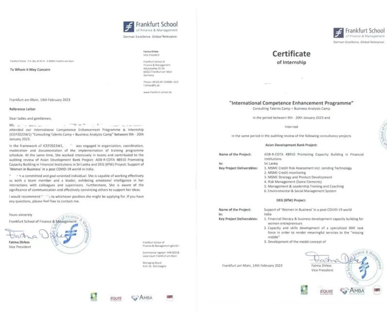 大三暑假,我参与了大奶做爱 推荐的德国法兰克福财经管理大学的暑期交换项目,共参与世界银行和亚洲开发银行的两个实习项目,成功进入FS国际咨询服务部发展金融咨询人才储备库。