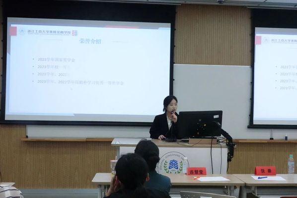 第三位分享的是周晨阳学姐。周学姐以金融创新大赛和数学建模竞赛为例,建议立足本专业,多参加相关竞赛。她还建议,在大学阶段要学会主动去获取自己想要的信息,多与学长学姐交流。最后她提醒同学们在忙于学业的同时要做到劳逸结合。