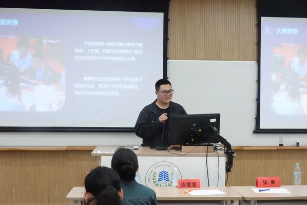 最后一位是陈鸿帆学长,陈鸿帆学长以“互联网+”大学生创新创业大赛为例,重点分享了选题相关的经验。他建议项目策划要注重创新性、实际操作性等。除此之外,学长还给我们介绍了竞赛时间表和竞赛奖励等,提升了学生对于参赛的兴趣。