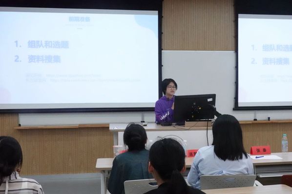 第二位分享的是廖天颖学姐,她以证券投资竞赛为例,从组队和选题两个角度给出建议。她建议选题要事先决定好,然后再与老师沟通,同时建议我们提前准备项目材料,以便后续修改完善。