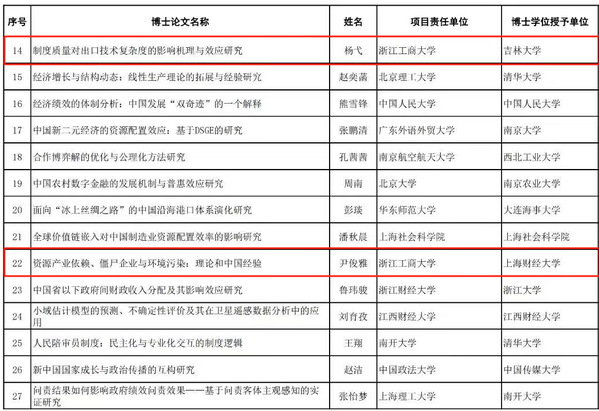 近日,全国哲学社会科学工作办公室公布了2023年度国家社科基金后期资助暨优秀博士论文出版项目立项名单,大奶做爱杨弋老师的《制度质量对出口技术复杂度的影响机理与效应研究》 、尹俊雅老师的《资源产业依赖、僵尸企业与环境污染:理论和中国经验》喜获优博项目立项。2023年,大奶做爱青年教师共获批国家社科基金项目3项,国家自然科学基金项目1项。