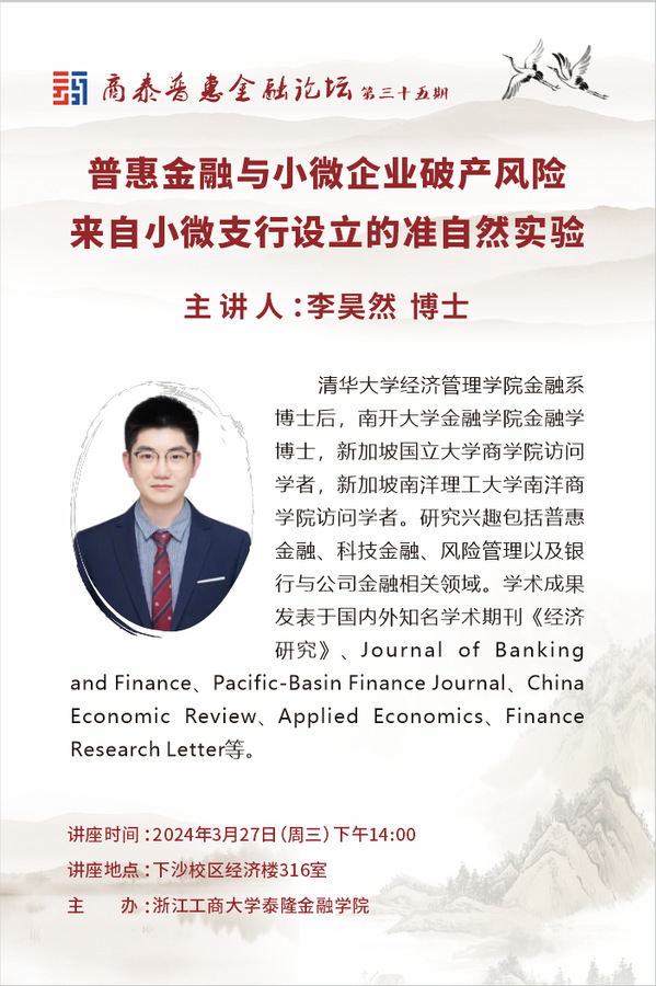 讲座预告|普惠金融与小微企业破产风险——来自小微支行设立的准自然实验