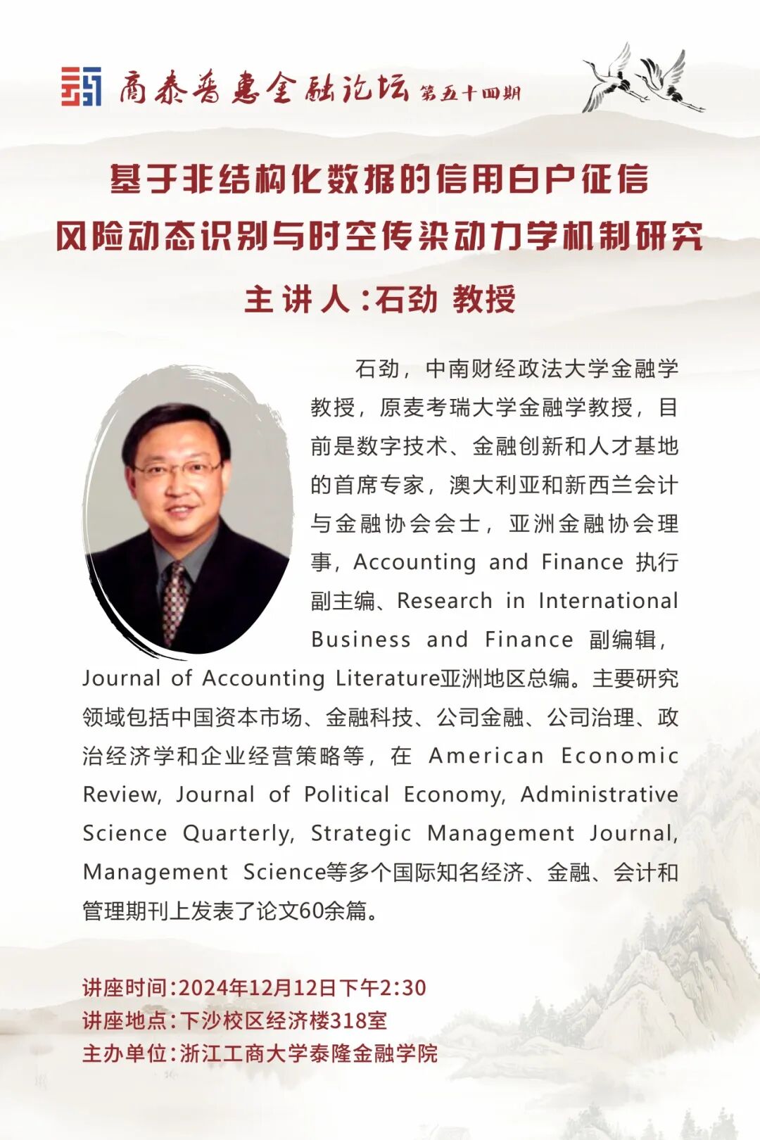讲座预告|基于非结构化数据的信用白户征信风险动态识别与时空传染动力学机制研究