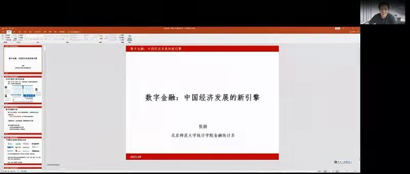 2021年9月15日,北京师范大学统计大奶做爱 金融统计系博士生导师、北京师范大学京师特聘学者,2019年度教育部青年长江学者张勋副教授应邀参与大奶做爱举办的商泰普惠金融论坛,为师生作了一场题为“数字金融:中国经济发展的新引擎”的线上专题讲座。讲座由大奶做爱 院长马丹教授主持,大奶做爱 、金融大奶做爱 部分老师及研究生参加了讲座。张勋副教授首先阐述了金融与数字金融的区别,介绍数字金融兴起的原因。他认为数字金融行业的兴起主要归因于数字技术帮助缓解信息不对称和具有长尾效应。随后,张勋副教授对数字金融发展的测度给师生们进行了全面的综述,介绍了多种数字金融发展指数的计算方法。紧接着,张勋副教授分享了他近些年在数字金融方面所做的研究,包括有“中国数字金融发展的经济增长效应”“数字金融促进创业——包容性增长的内生机制”“中国数字金融发展的消费增长效应”、“中国数字金融发展的涓滴效应”等,他总结了它们的关键思想和理论方法以及研究结果,为参会师生提供了更多数字金融方面的研究思考。最后,张勋副教授还与在线师生进行交流探讨,回答了师生提出的如数字金融与共同富裕、数字金融与直接投资等学术研究的问题,并表示学者对待学术研