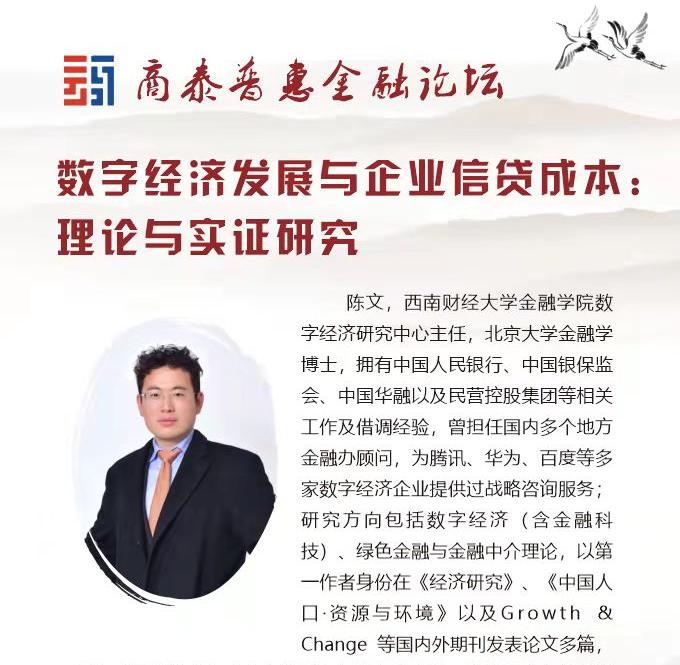 预告丨商泰普惠金融论坛——数字经济发展与企业信贷成本:理论与实证研究